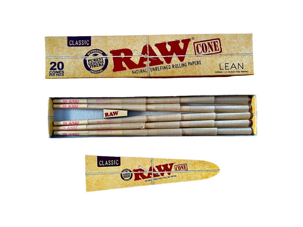 RAW Classic Lean Cones are available in a 20 Cone Pack and a 800 Piece Bulk Box.