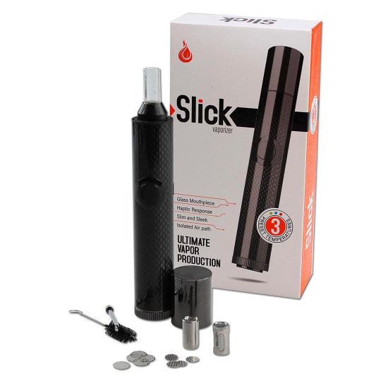 The Slick Vaporizer is budget-friendly but it sports features that are usually found only on mid or high range vaporizers. Removable 18650 battery, haptic feedback when vaping temperature is reached, magnetic mouthpiece cover, glass mouthpiece to preserve flavour, great built quality with carbon fibre body and black ceramic heating chamber that can hold up to 0.4g of dry herb.